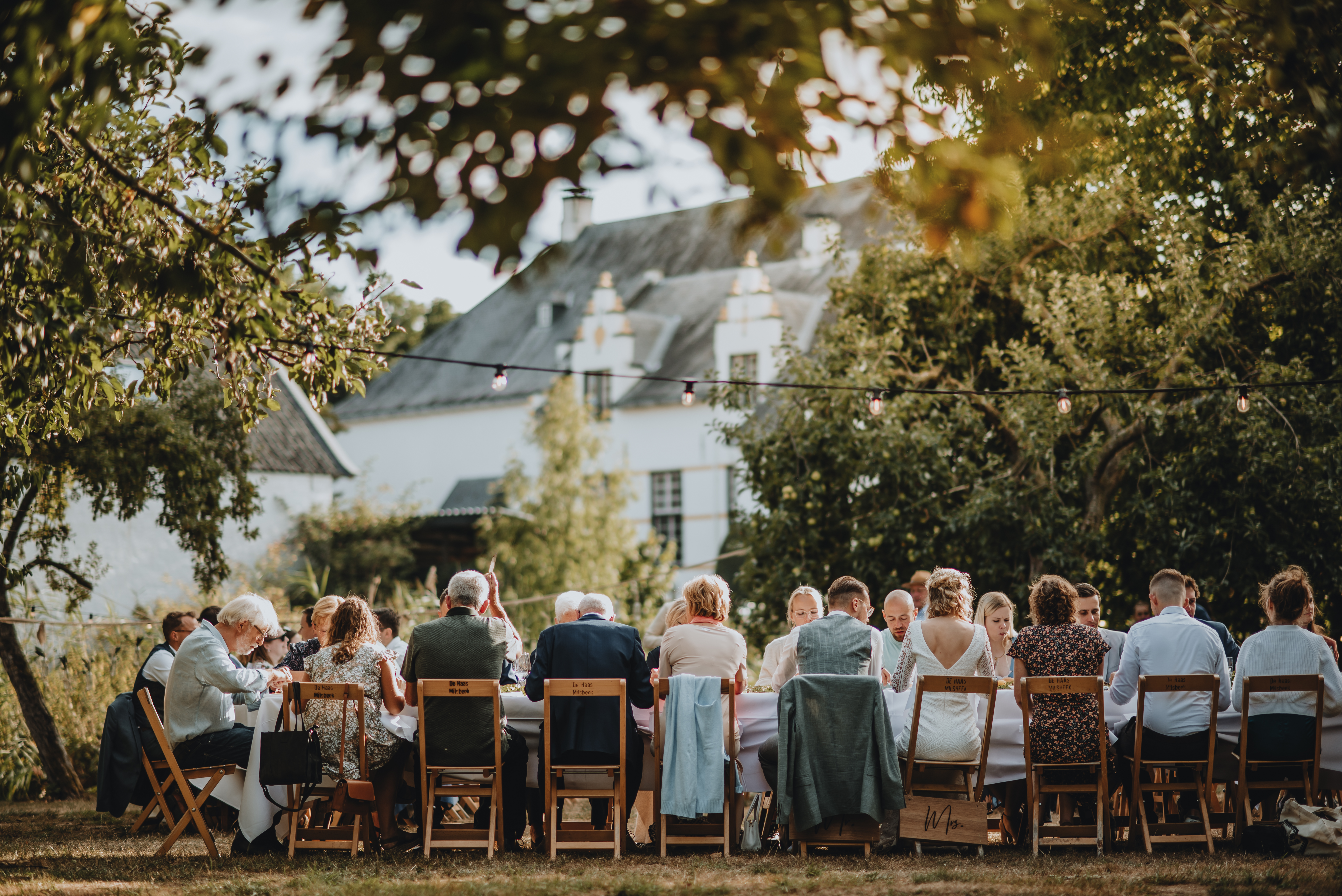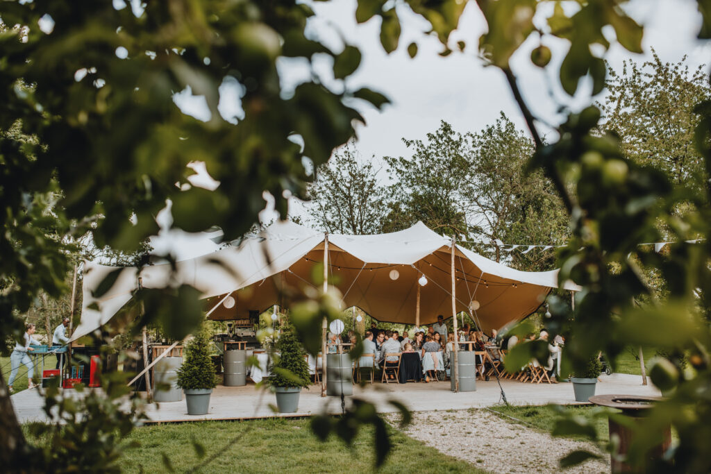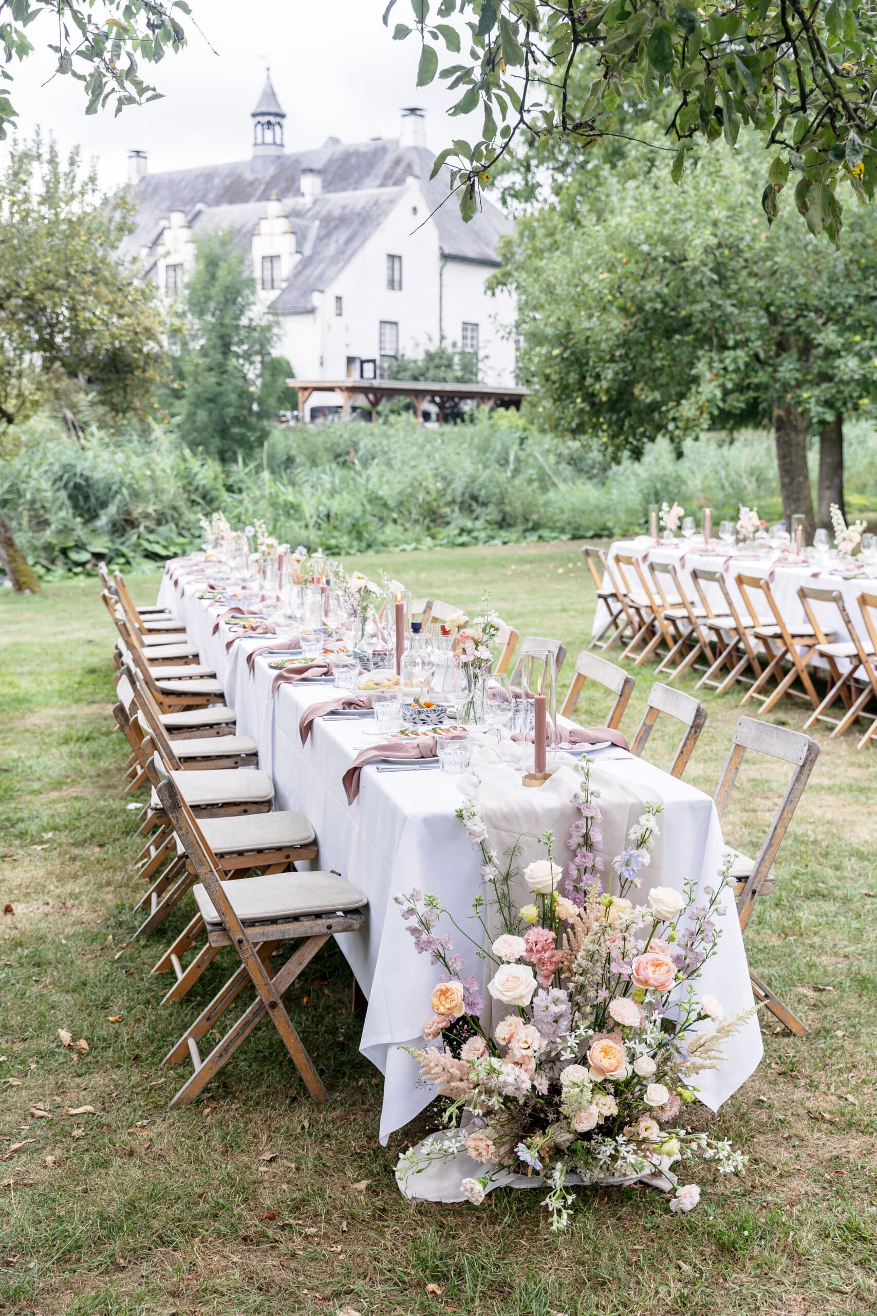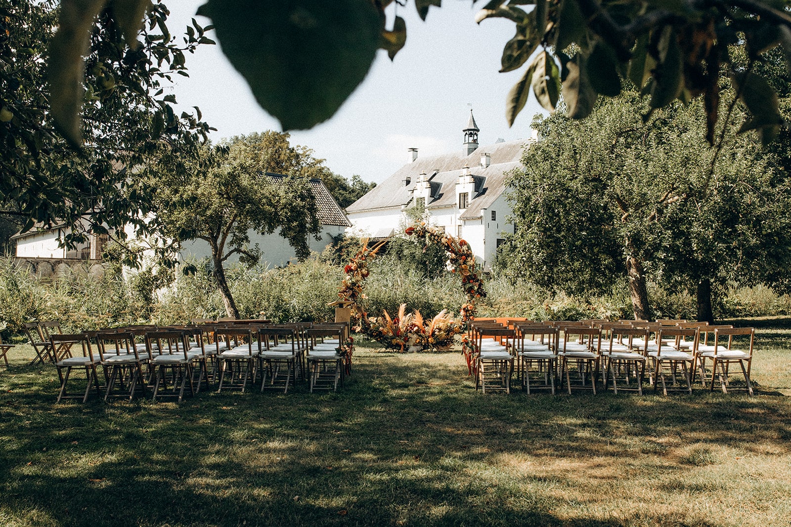 Een prachtige ruime boomgaard vol met appelbomen, met uitzicht op het Slot en de ondergaande zon. Een prachtig decor midden in de natuur voor de ceremonie, fotoshoot of diner met wit linnen gedekte tafels tijdens een bruiloft. De boomgaard is via een bruggetje gekoppeld met de Wijngaard. Creëer je eigen setting van festival tot romantische mediterrane sferen.