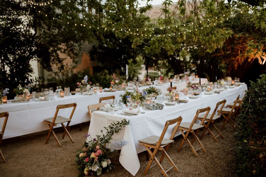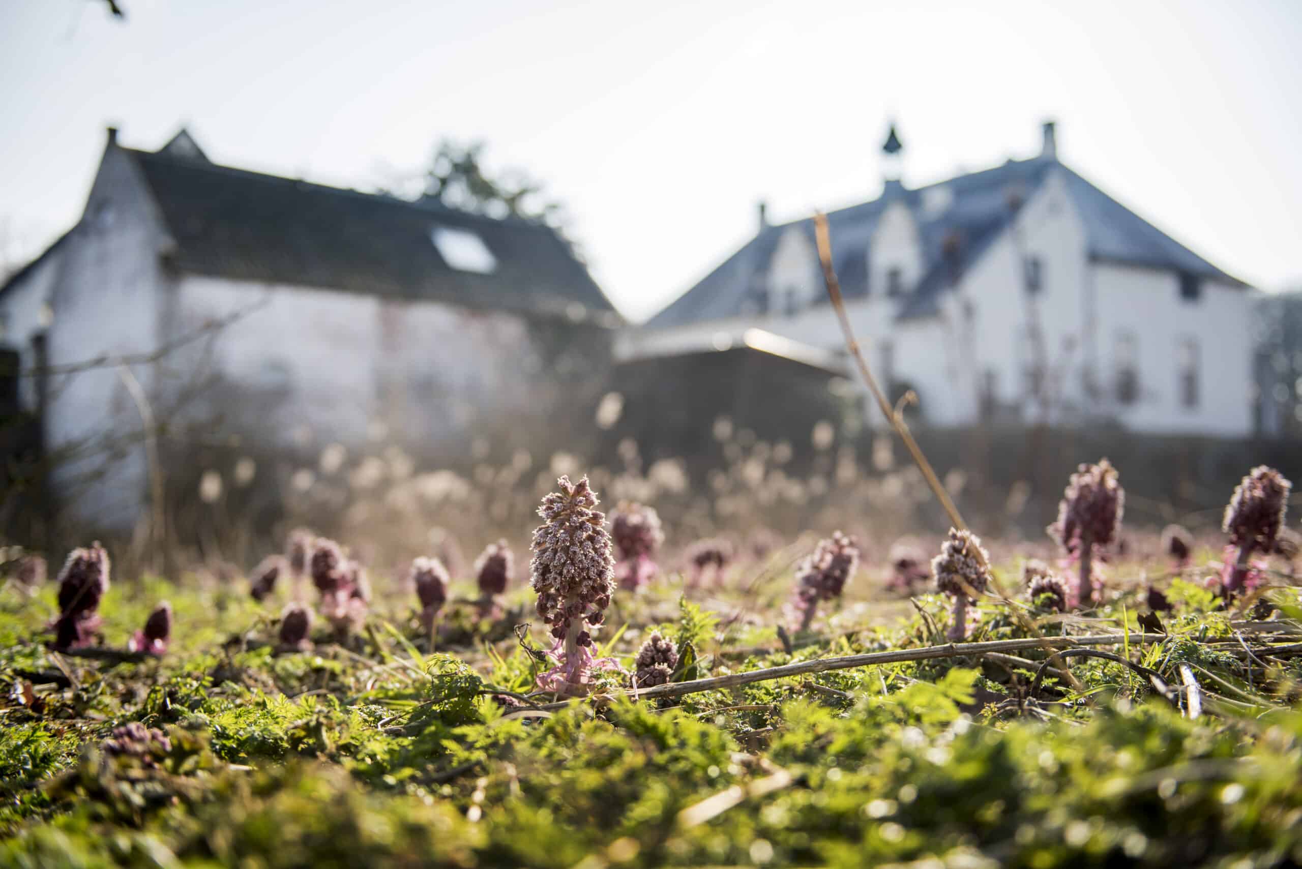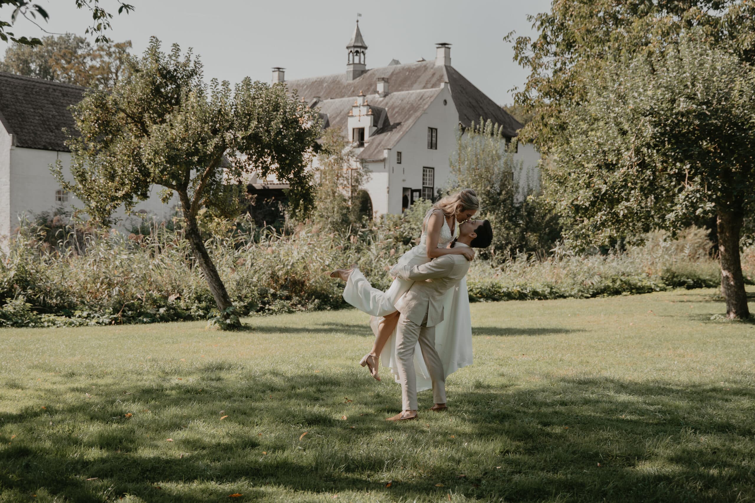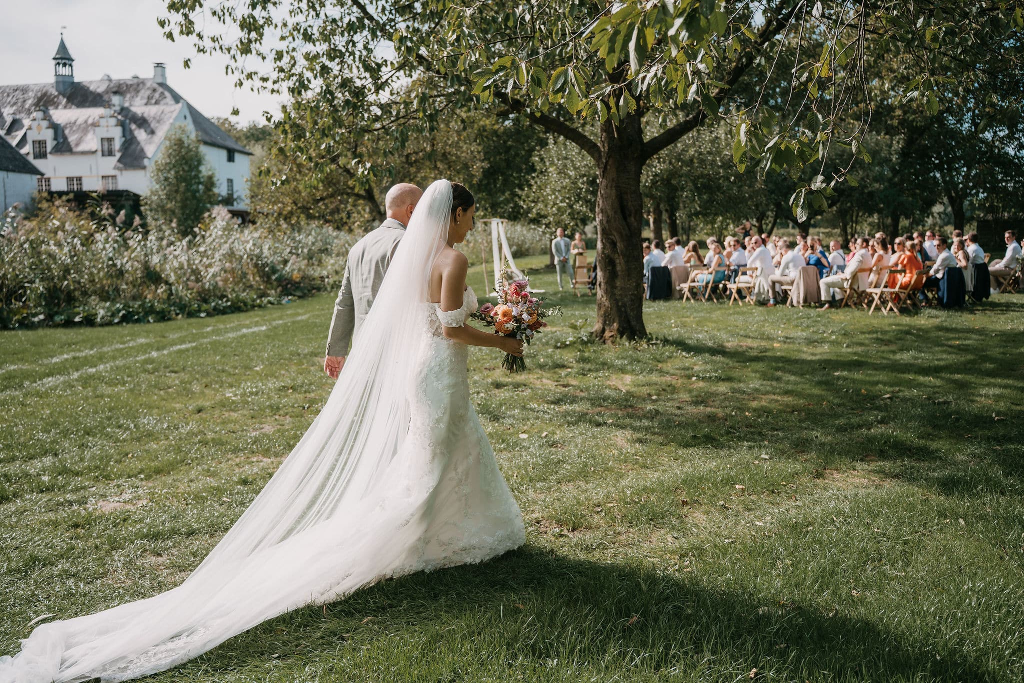 Een prachtige ruime boomgaard vol met appelbomen, met uitzicht op het Slot en de ondergaande zon. Een prachtig decor midden in de natuur voor de ceremonie, fotoshoot of diner met wit linnen gedekte tafels tijdens een bruiloft. De boomgaard is via een bruggetje gekoppeld met de Wijngaard. Creëer je eigen setting van festival tot romantische mediterrane sferen.
